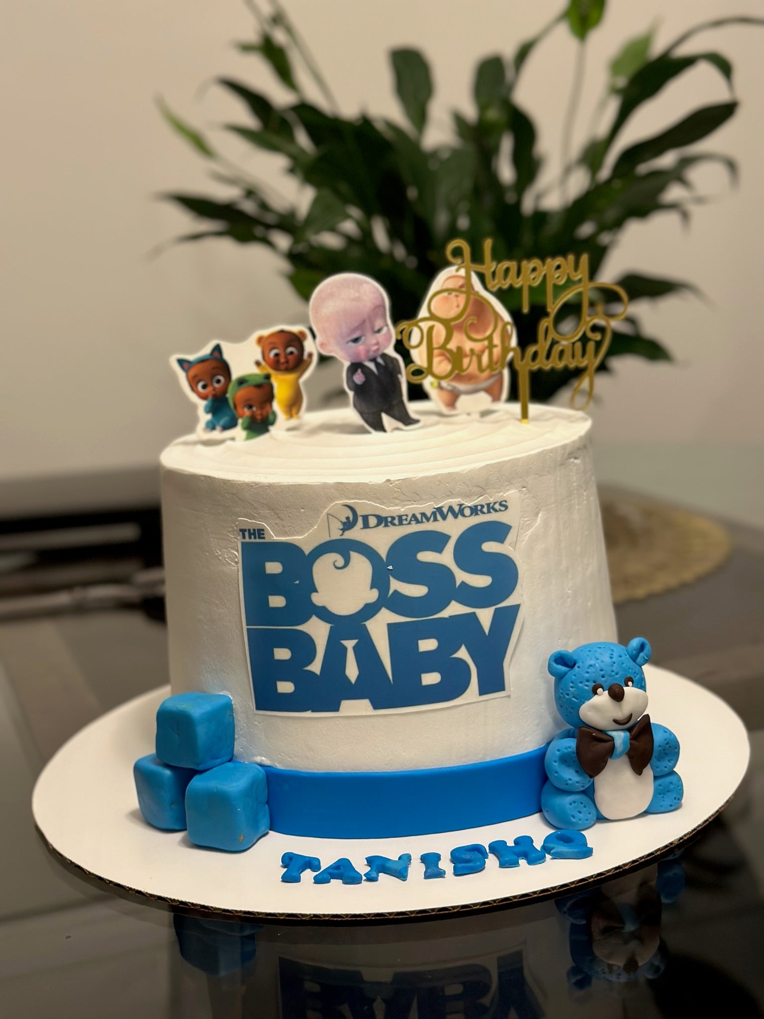 A fun and charming cake inspired by the popular Boss Baby movie, featuring character toppers and the iconic logo. Decorated in crisp white and vibrant blue, complete with blue fondant blocks and a cute blue teddy bear wearing a bow tie. Personalized with the name "Tanishq" for an extra special touch — perfect for a little boss’s big celebration!