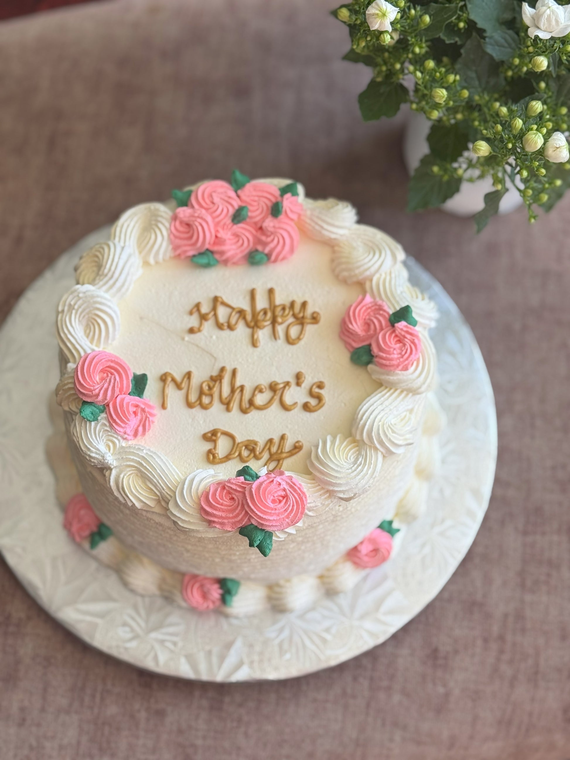Celebrate the most special woman in your life with this beautifully crafted Mother’s Day cake. Adorned with delicate pink and white cream rosettes and soft piped swirls, this cake exudes grace and warmth. Finished with a heartfelt “Happy Mother’s Day” message in elegant gold lettering, it’s the perfect centerpiece to show your love and appreciation. Sweet, timeless, and full of love — just like mom.