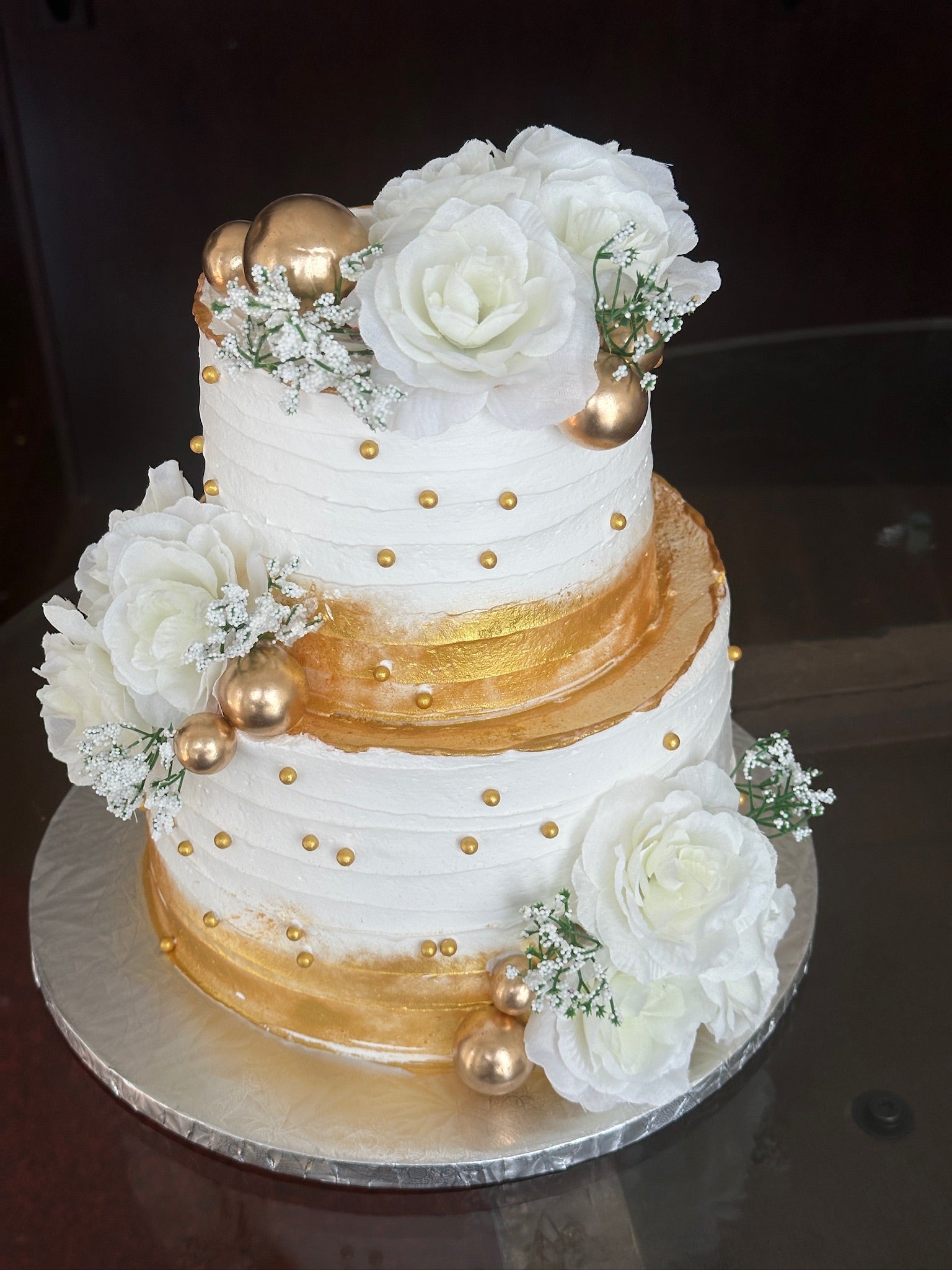 This stunning two-tier cake exudes timeless sophistication with its crisp white base and luxurious hand-painted gold brush accents. Each tier is adorned with elegant gold pearls that add a touch of sparkle and regal charm. The cake is beautifully decorated with lush white roses and delicate baby’s breath, creating a soft and romantic floral arrangement.