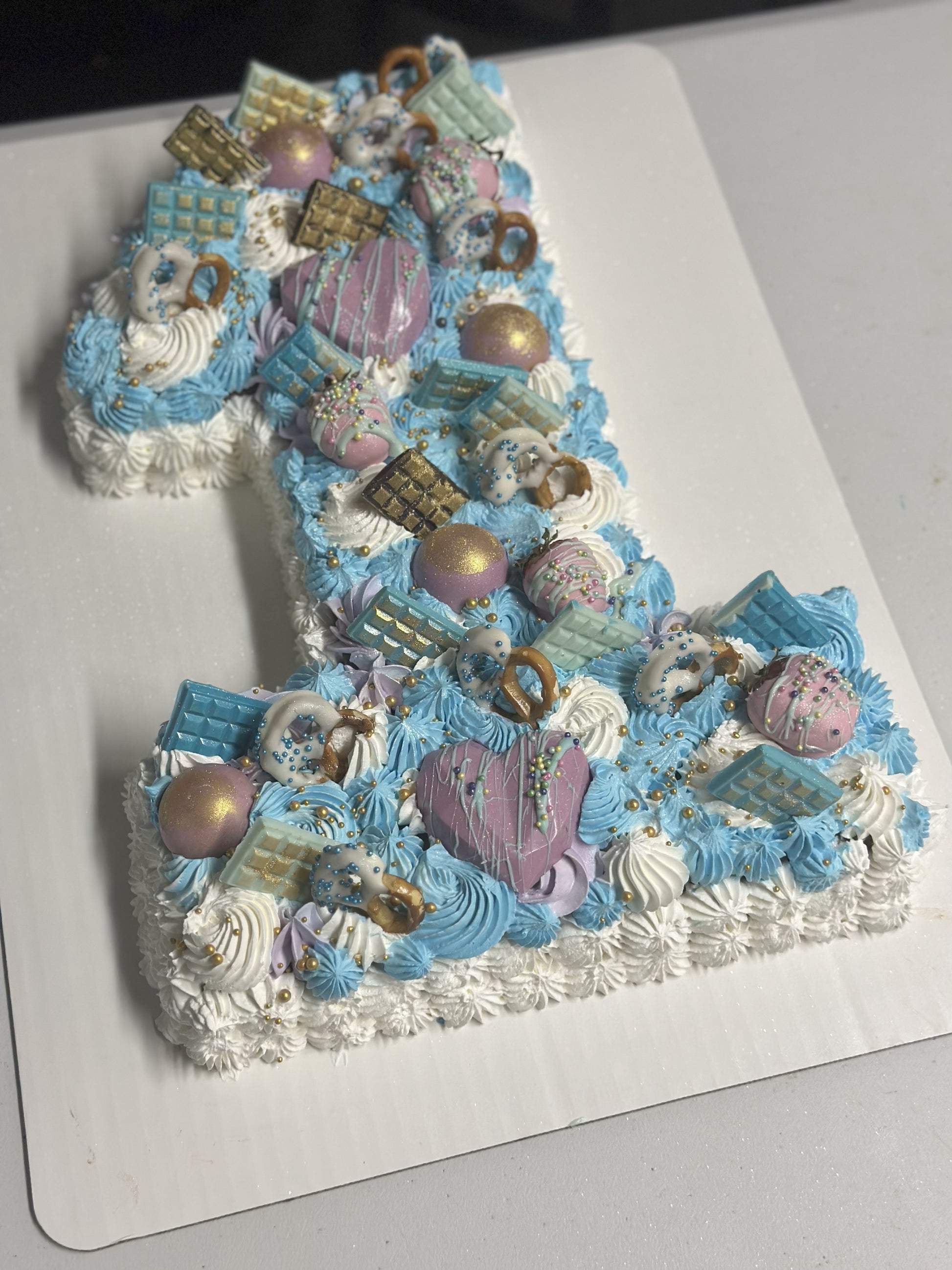Celebrate your little one’s first birthday in style with this show-stopping number “1” cake, bursting with color, texture, and treats. Decorated in a playful palette of blue, lavender, and white whipped cream, this cake is topped with an array of delightful sweets—gold-brushed chocolates, pastel chocolate bars, heart-shaped confections, colorful pretzels, cake truffles, and sprinkles galore. A perfect balance of elegance and fun for a dreamy dessert table centerpiece.