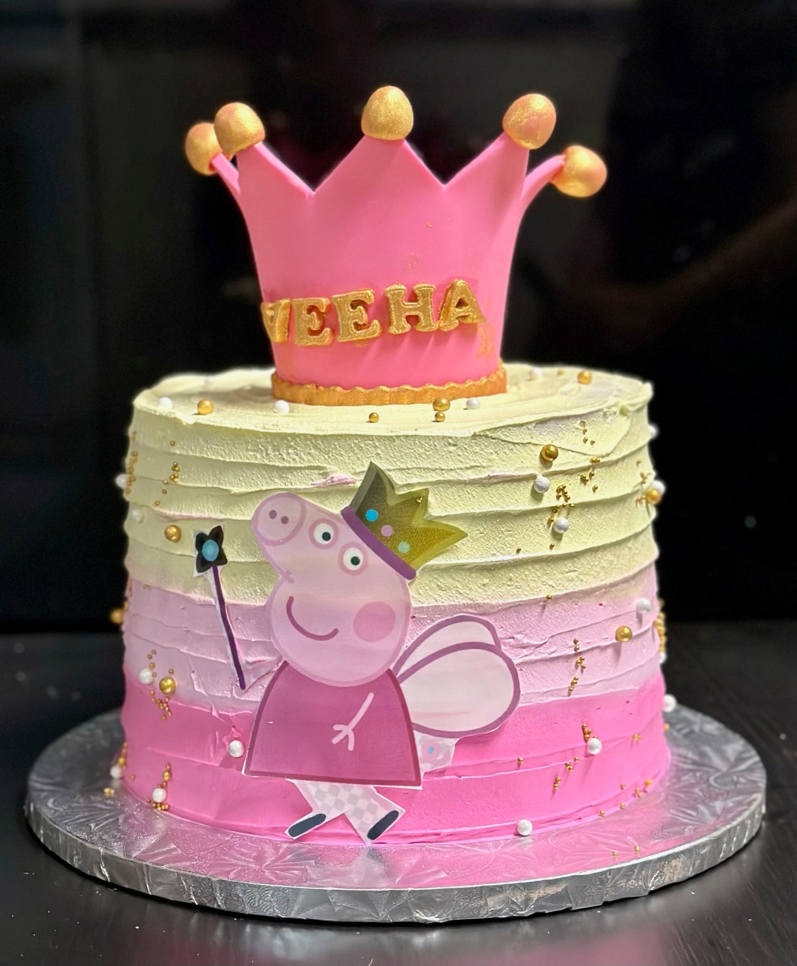 Adorable ombré pink and cream cake featuring Peppa Pig as a fairy princess, decorated with pearls, gold accents, and topped with a striking pink crown personalized with "VEEHA". Perfect for a magical princess birthday celebration!